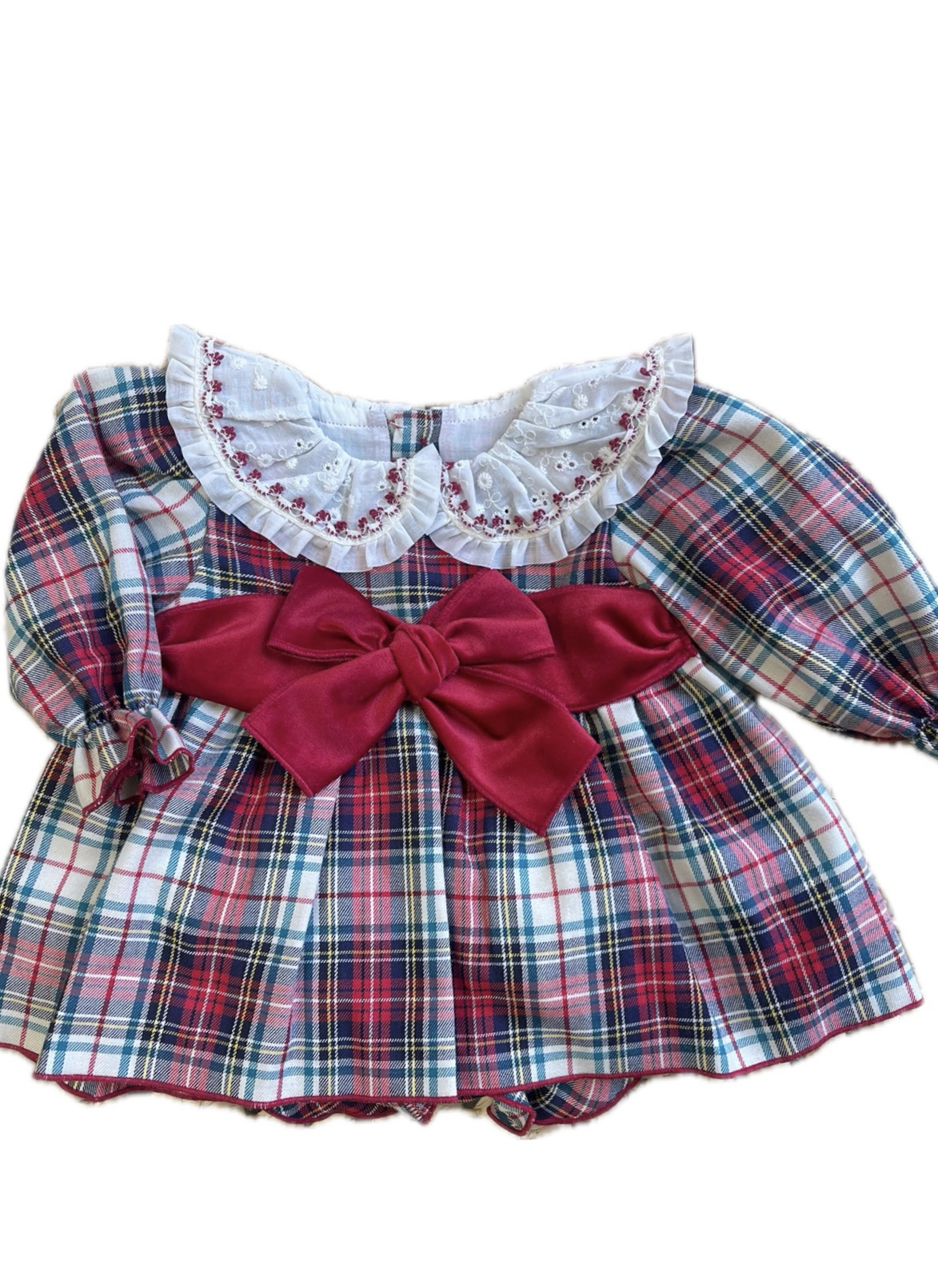 abito in caldo cotone , fantasia tartan con fiocco in velluto rosso e colletto di camicia bianco.