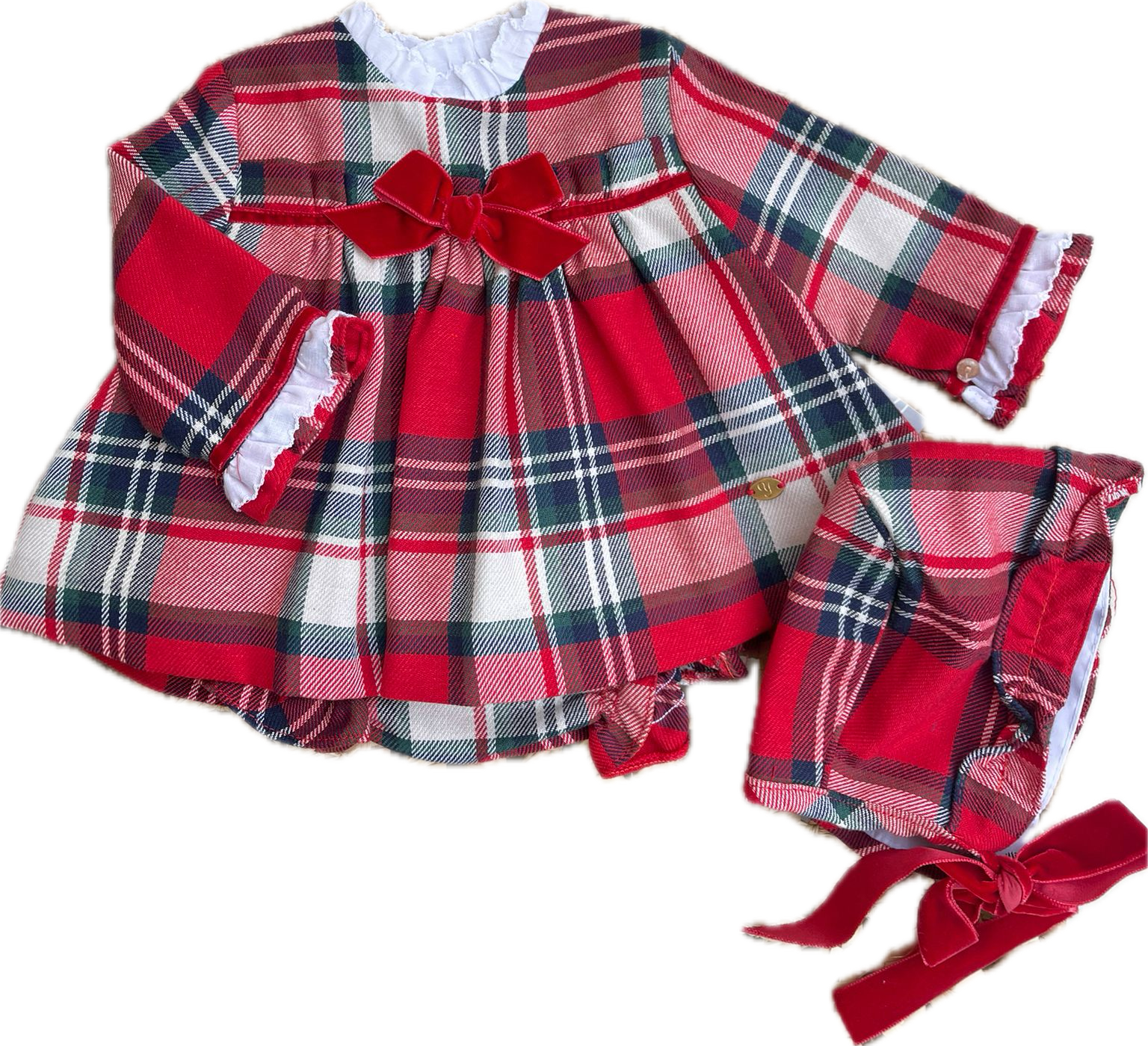 Abito in caldo cotone , colletto a pistagnina , fiocco in velluto e cuffia compresa .