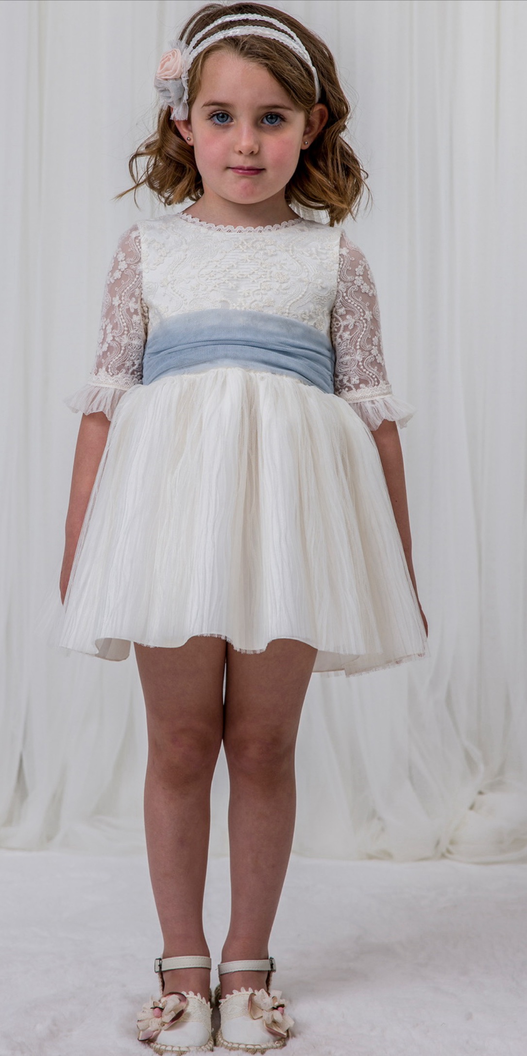 Abito in pizzo con cintura in tulle azzurra.
