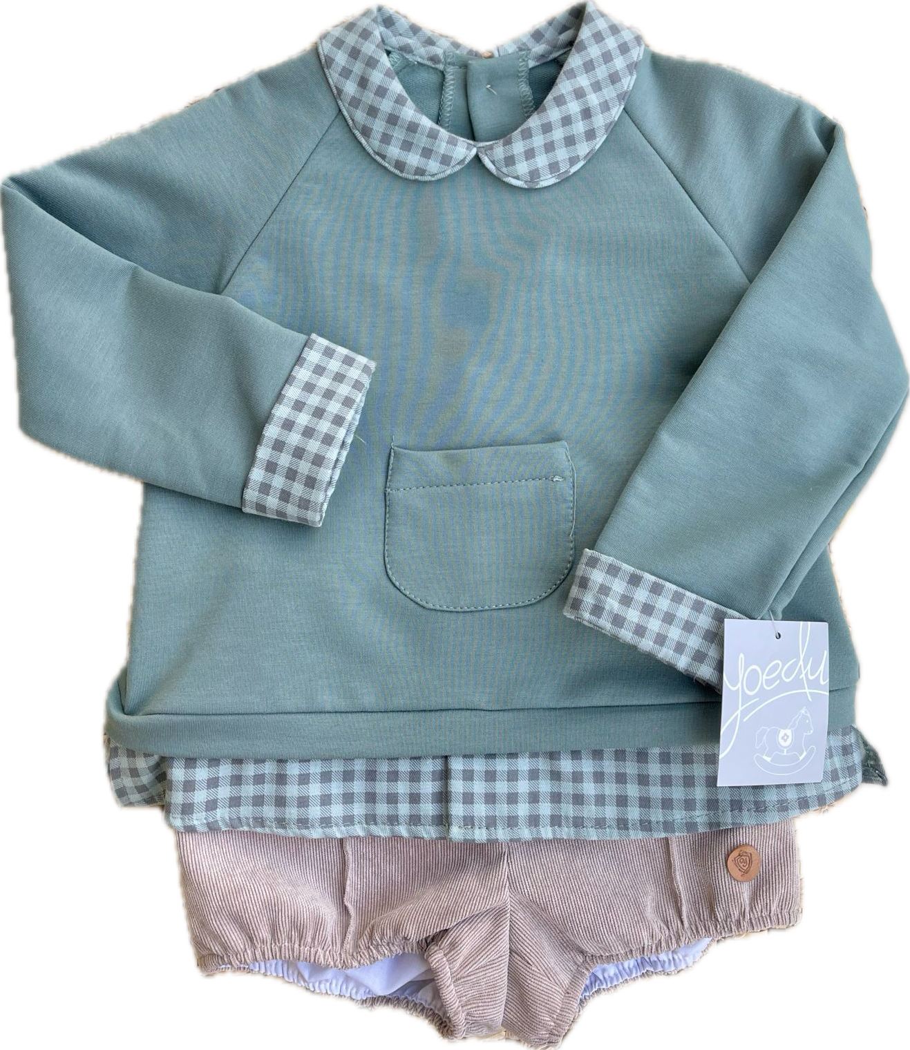 Due pezzi ; felpa con colletto di finta camicia e taschino . short in vellutino.