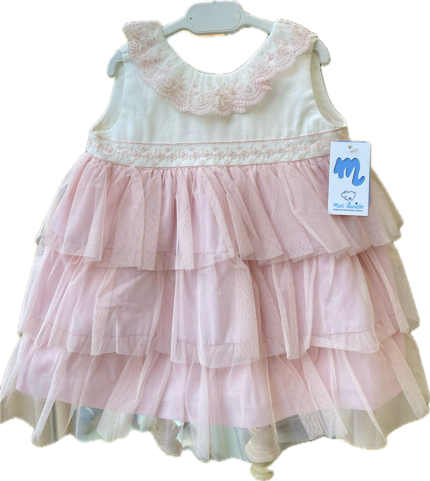Abito in cotone con balze di tulle . collo ricamato in pizzo