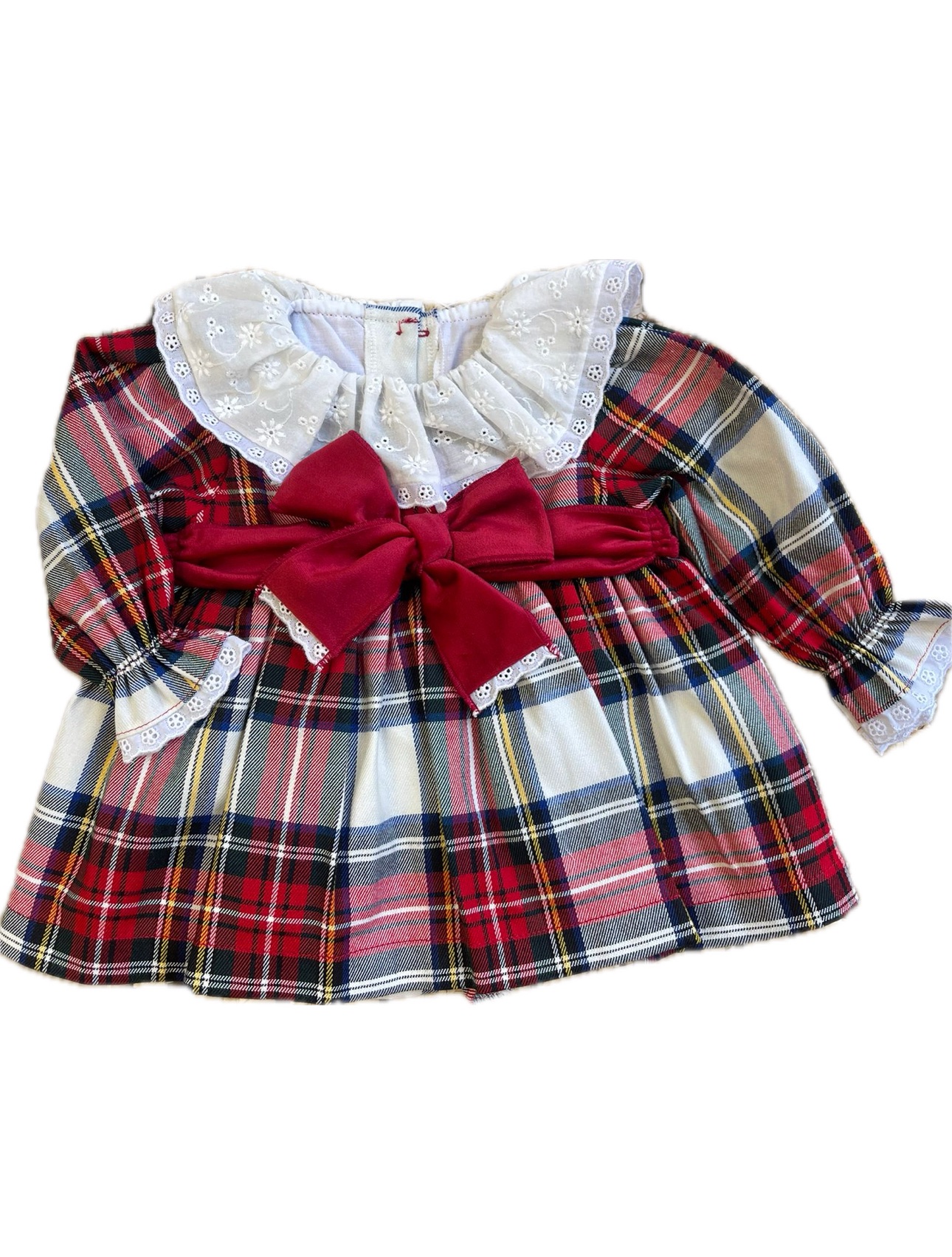 Abito in caldo cotone , fantasia tartan, fiocco in velluto in vita rosso, colletto bianco di cotone.