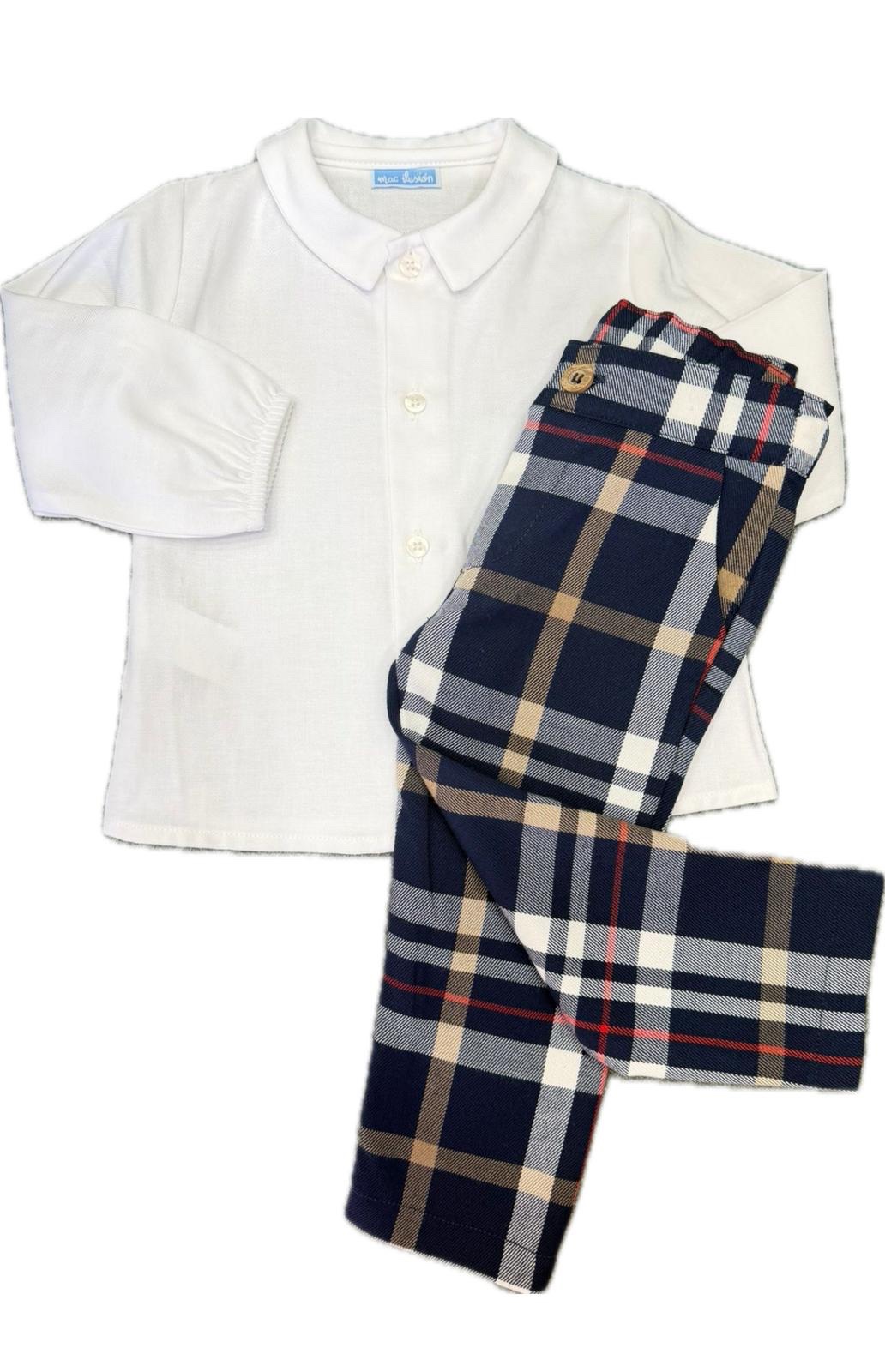 camicia bianca in caldo cotone. golfino a punta in filo , pantalone lungo con elastico regolabile interno.