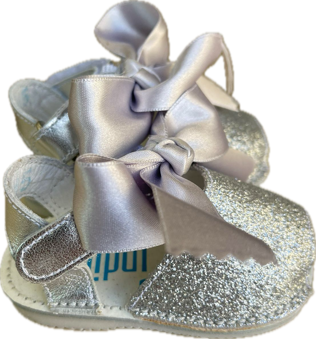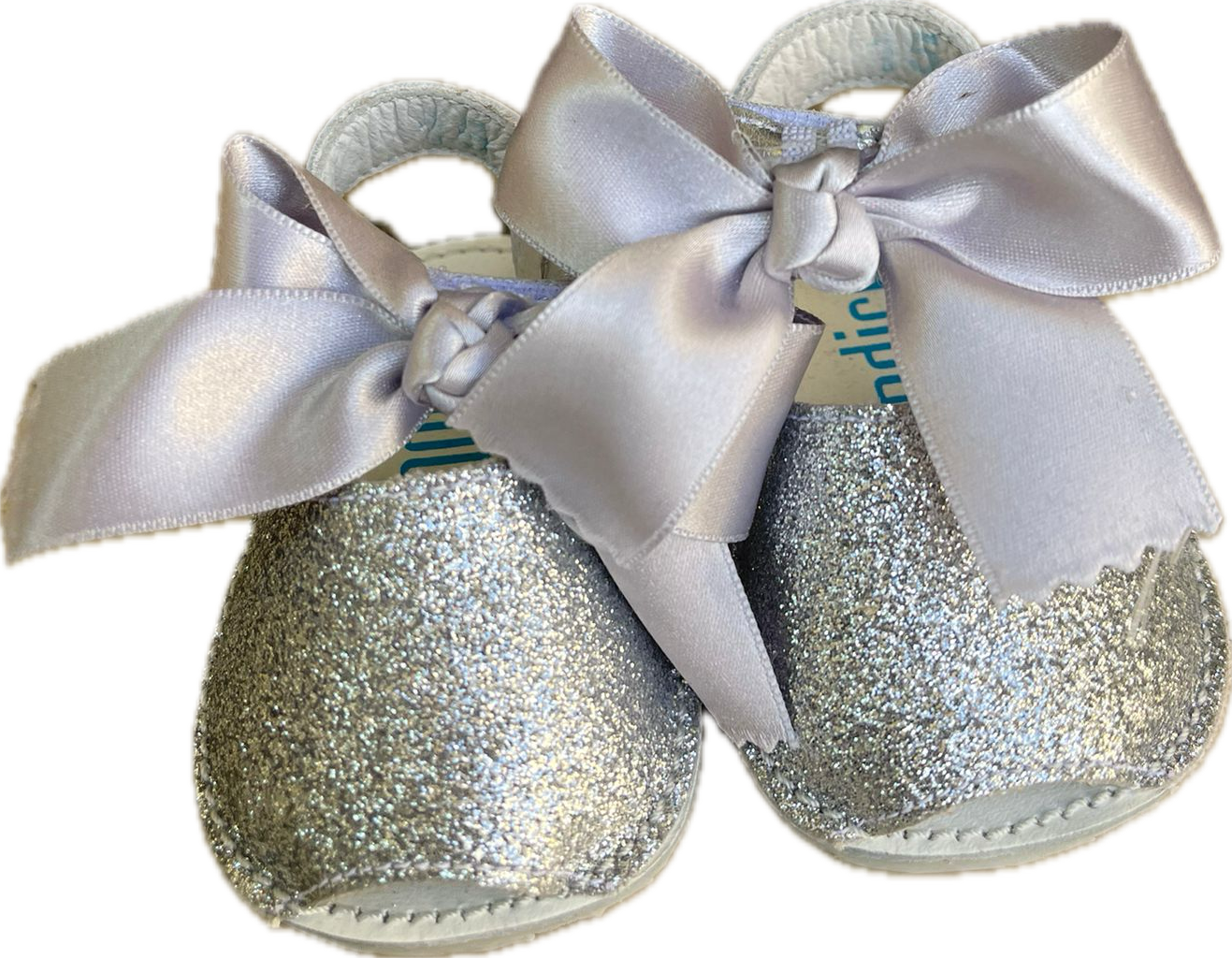 Minorchina argento brillantinata con fiocco in raso rimovibile .