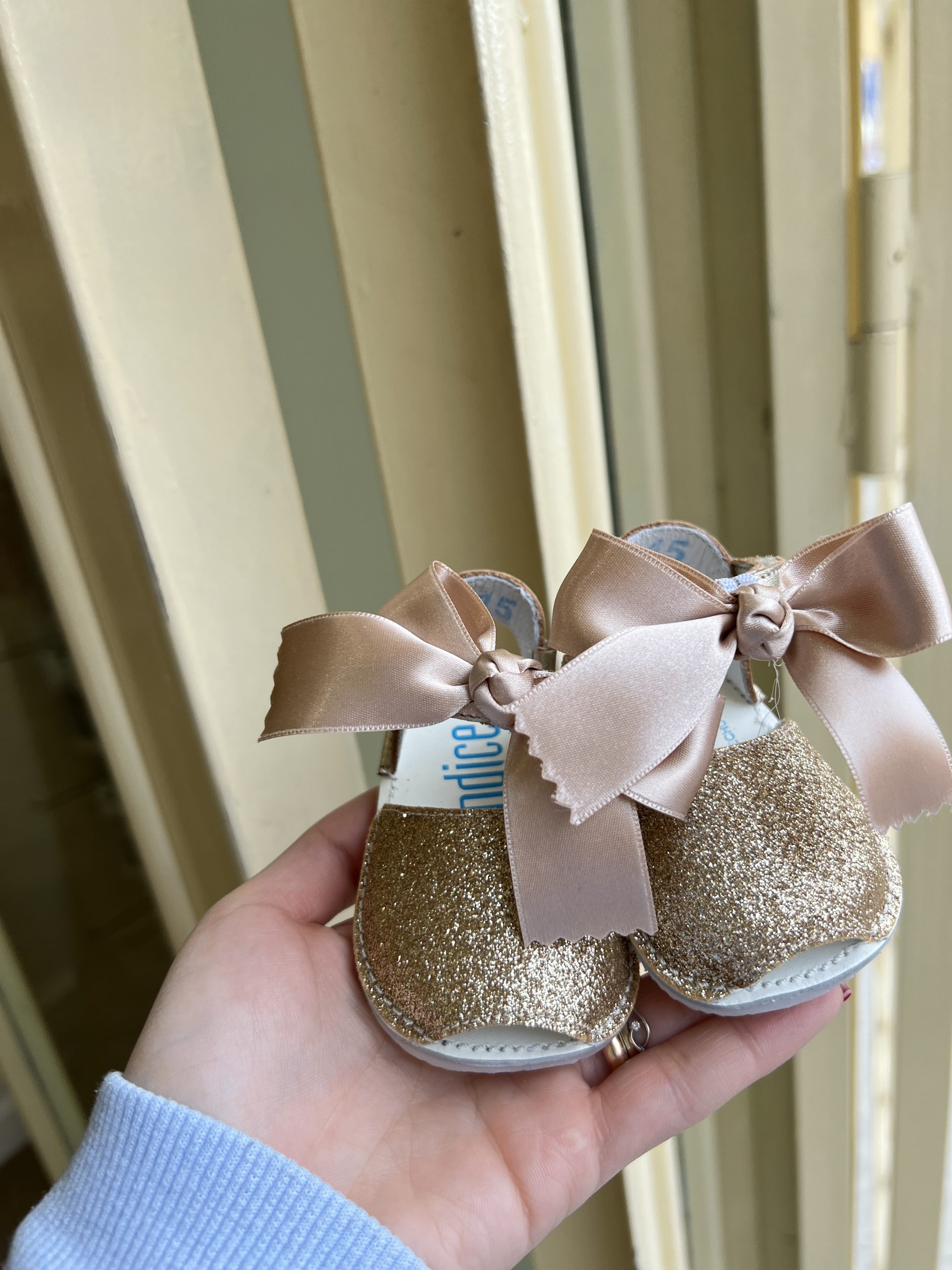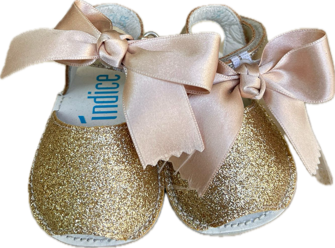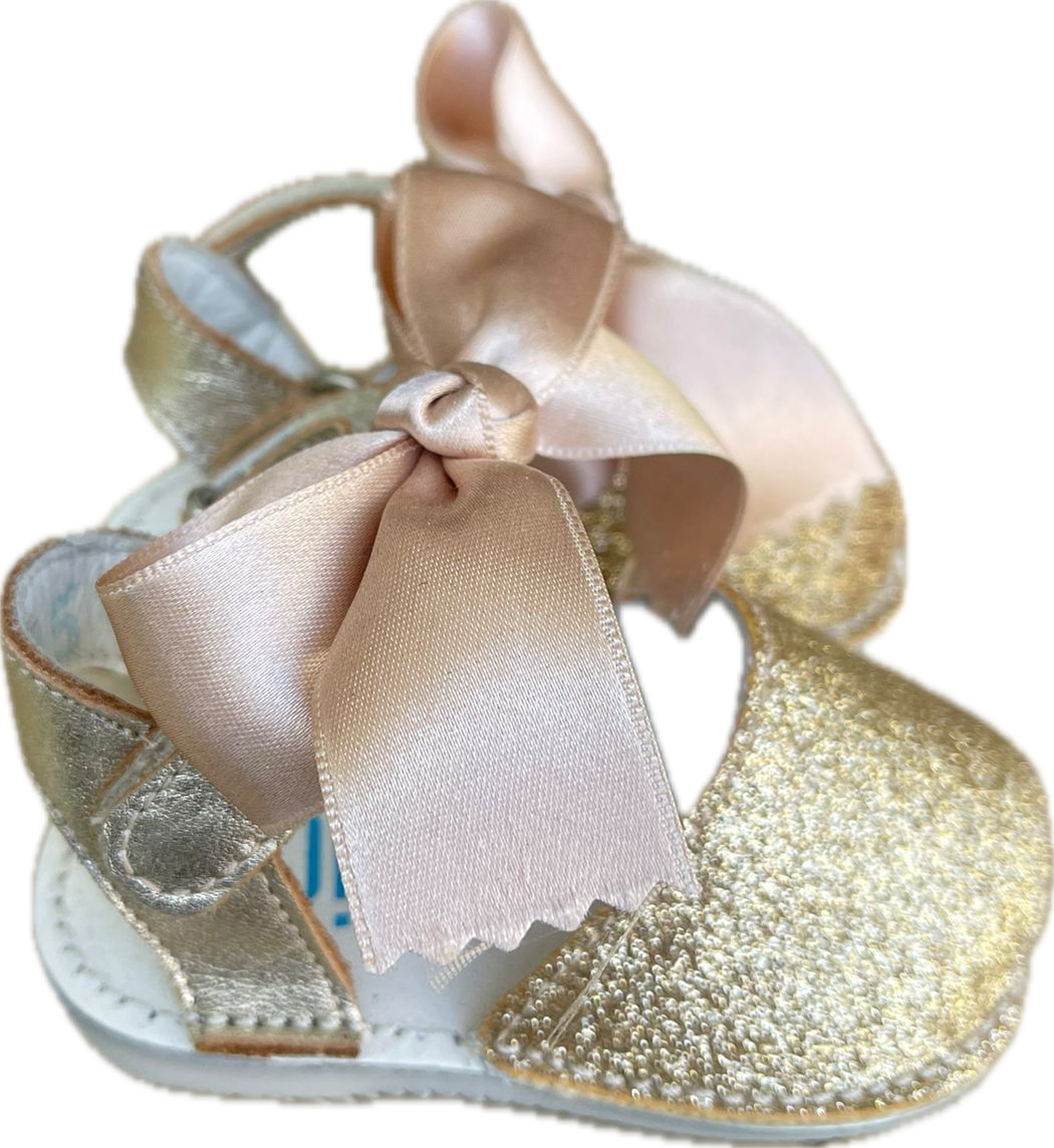 Minorchina oro brillantinata con fiocco in raso rimovibile.