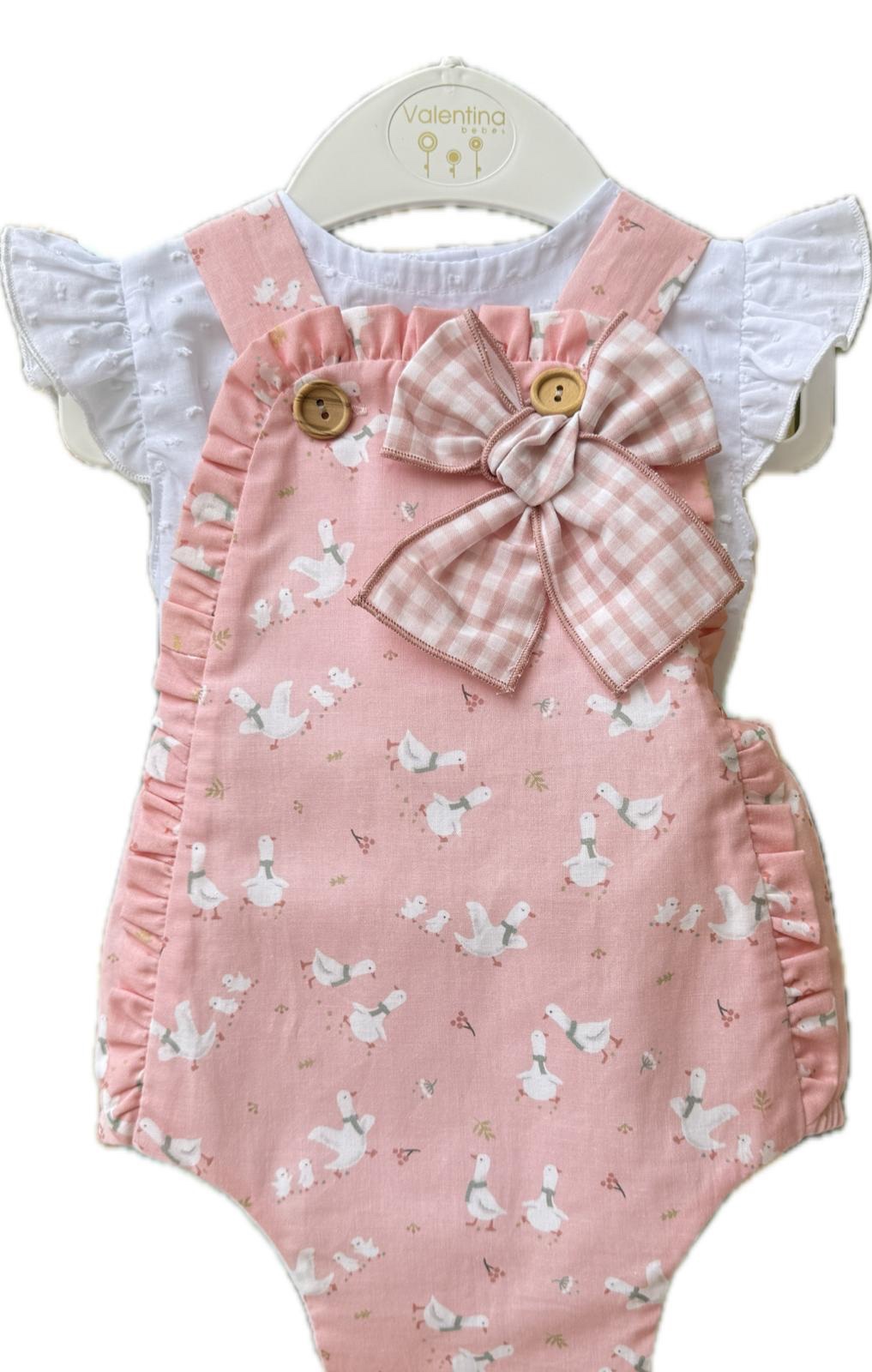 Camicia con rush sulle spalle e salopette con fantasia oche