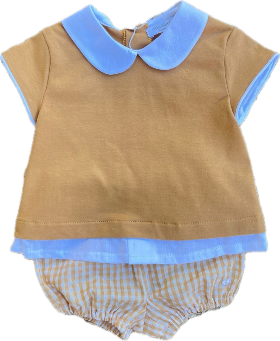 due pezzi ; maglia con colletto finta camicia e short a quadretti.