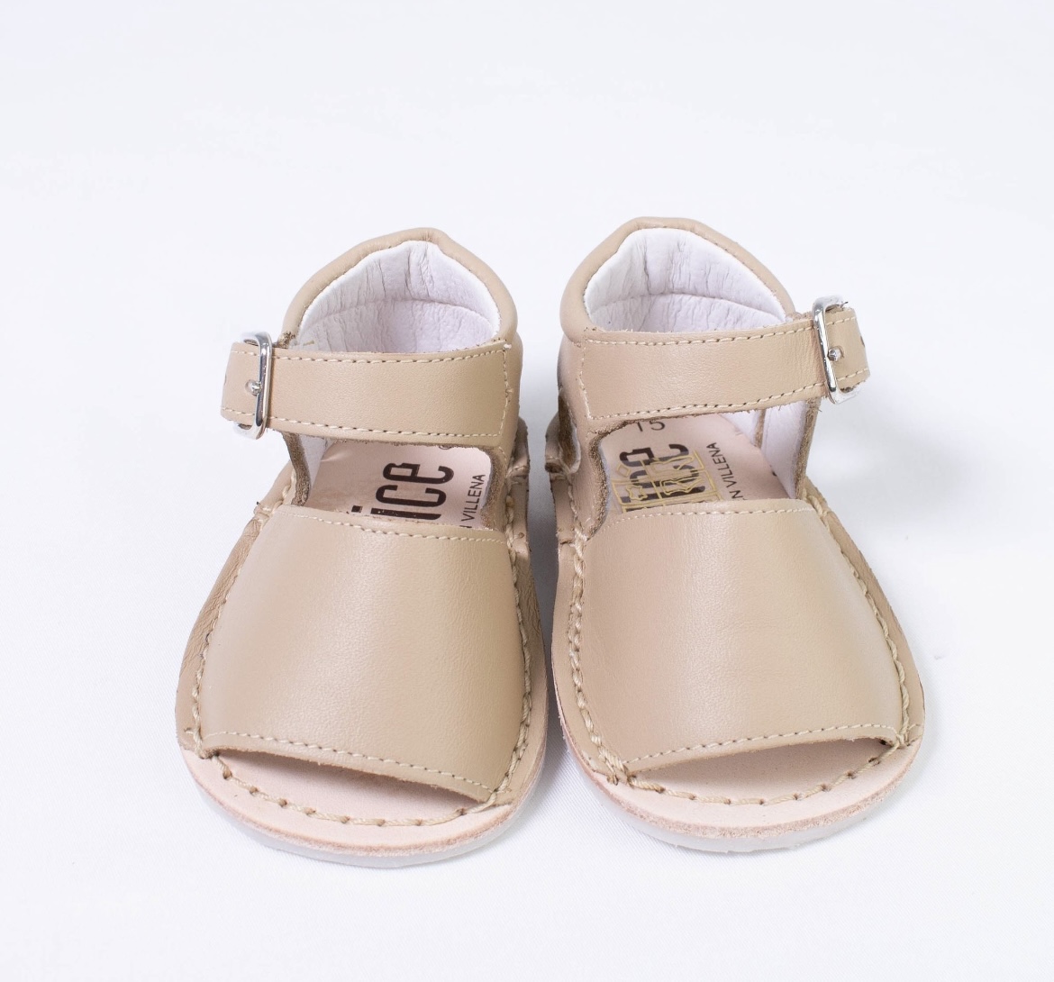 Sandalo in pelle con suola rigida con cinturino laterale e chiusura sul retro.