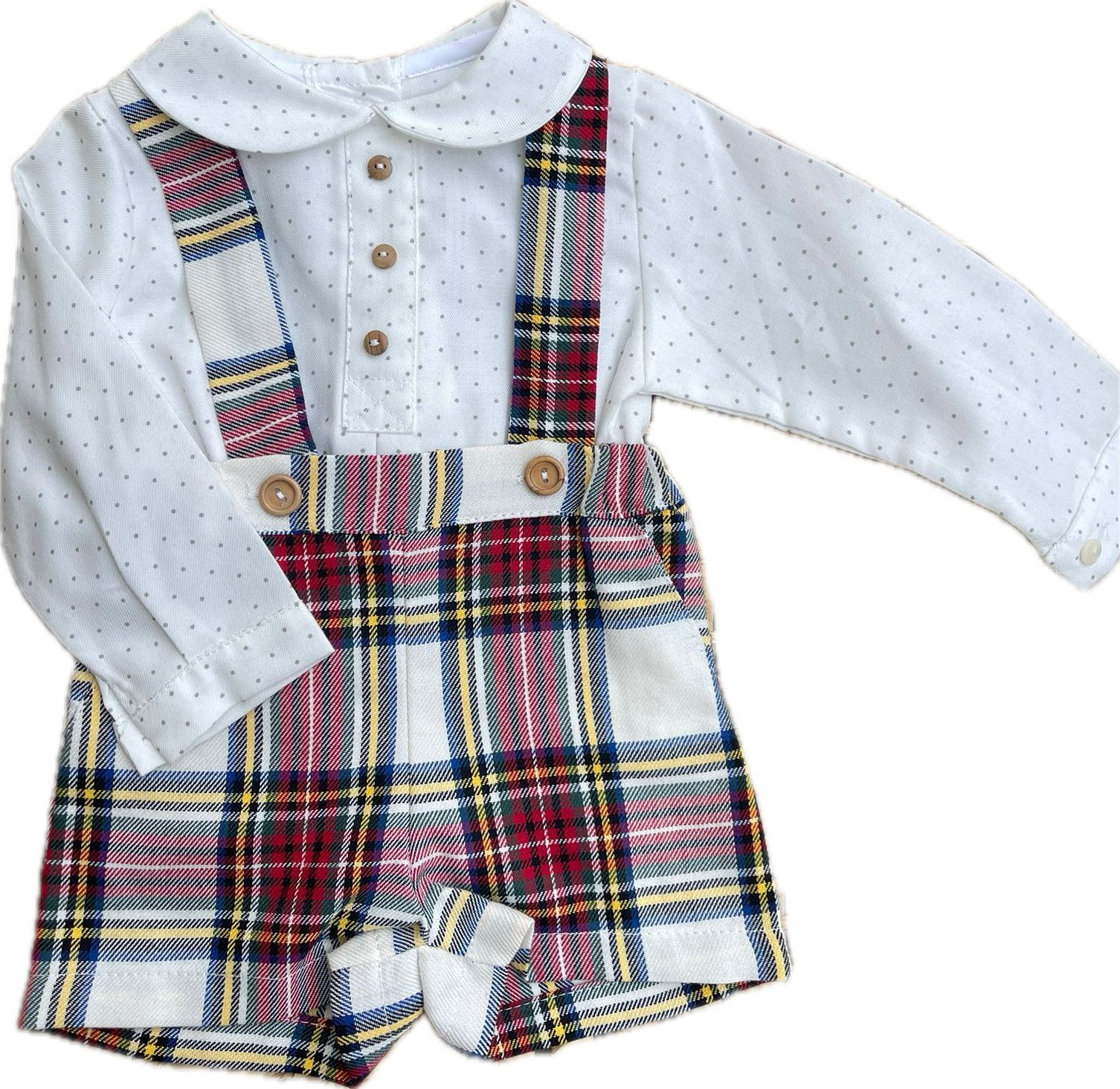 Salopette a quadri con bottoncini in legno e camicia a pois con colletto tondo .