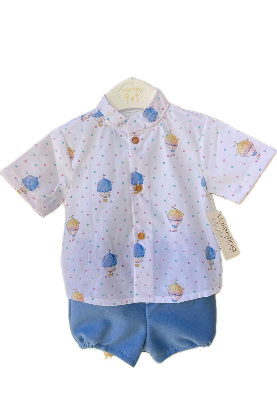 Camicia con collo coreano , bianca con stampa mongolfiera e short in azzurro