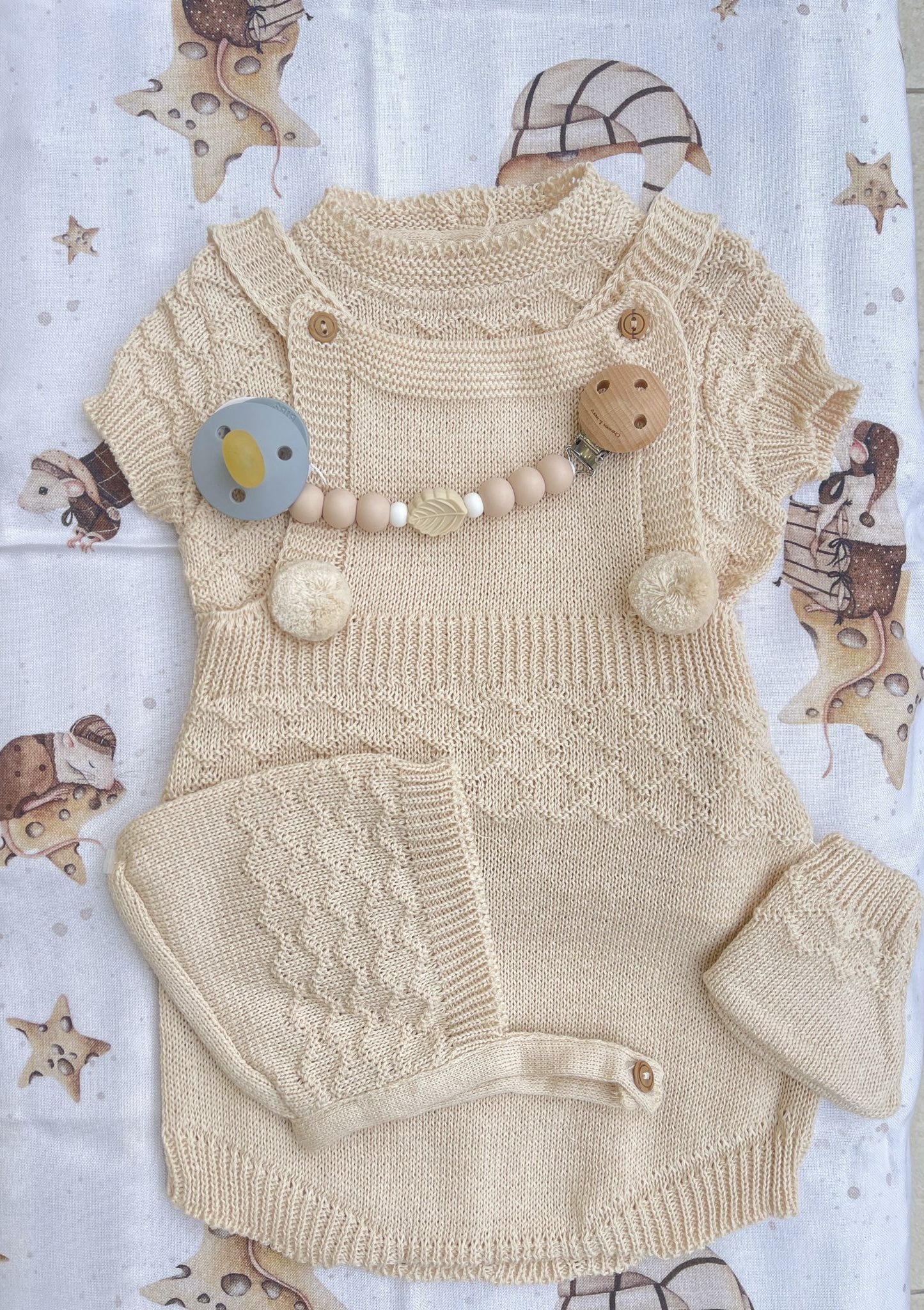 Set pagliaccetto in filo di cotone con maglia mezza manica in filo , scarpine e cuffietta.