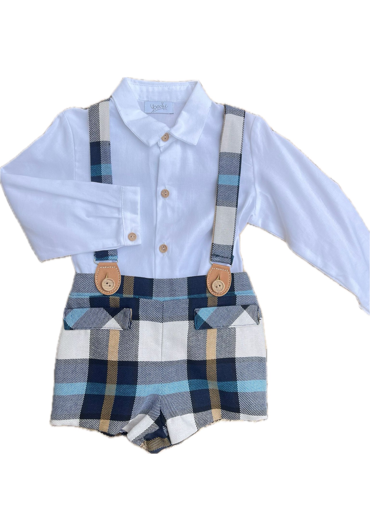 Completo salopette e camicia bianca.