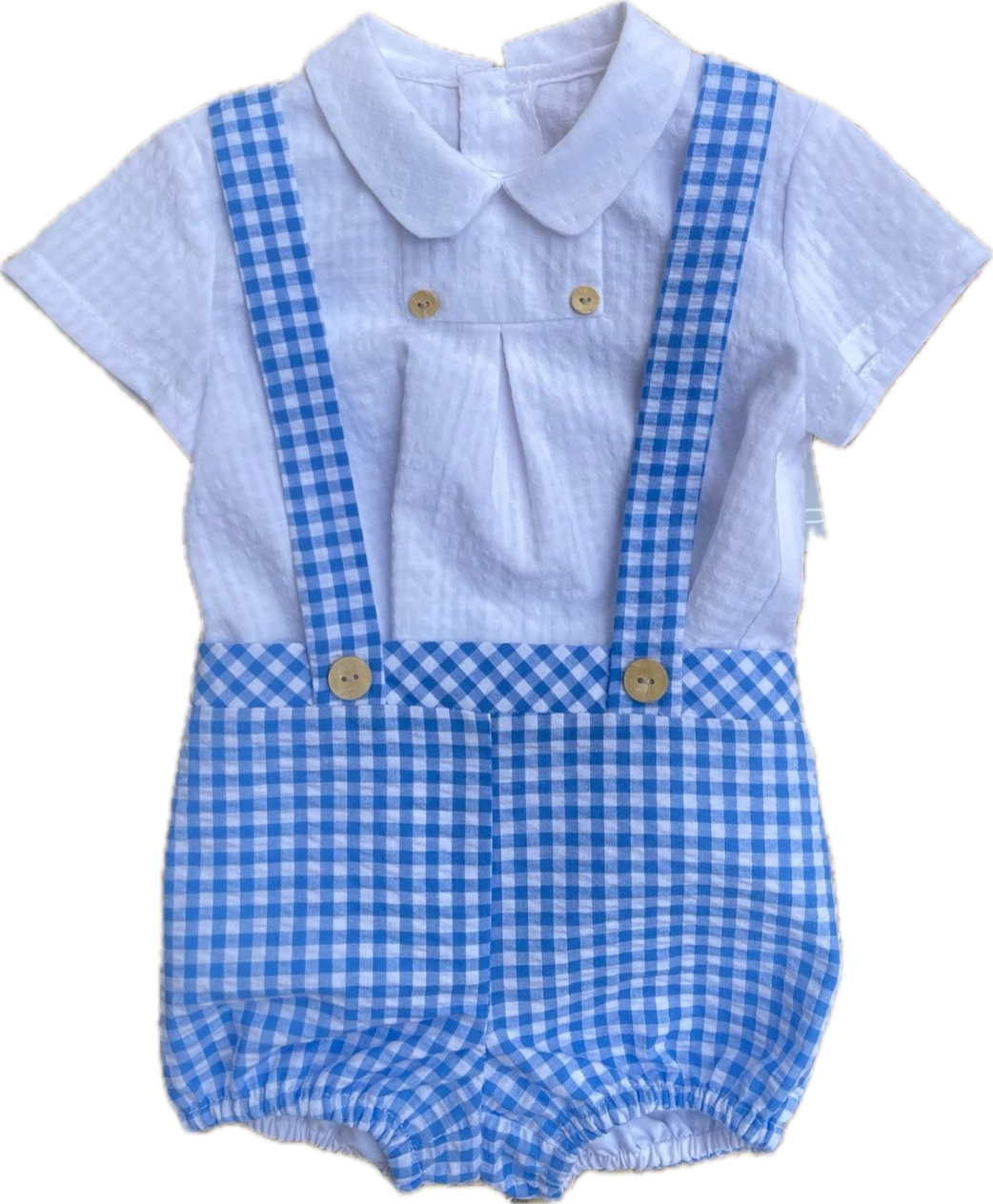 completino camicia con apertura posteriore ,pantaloncino con bretelle cucite.