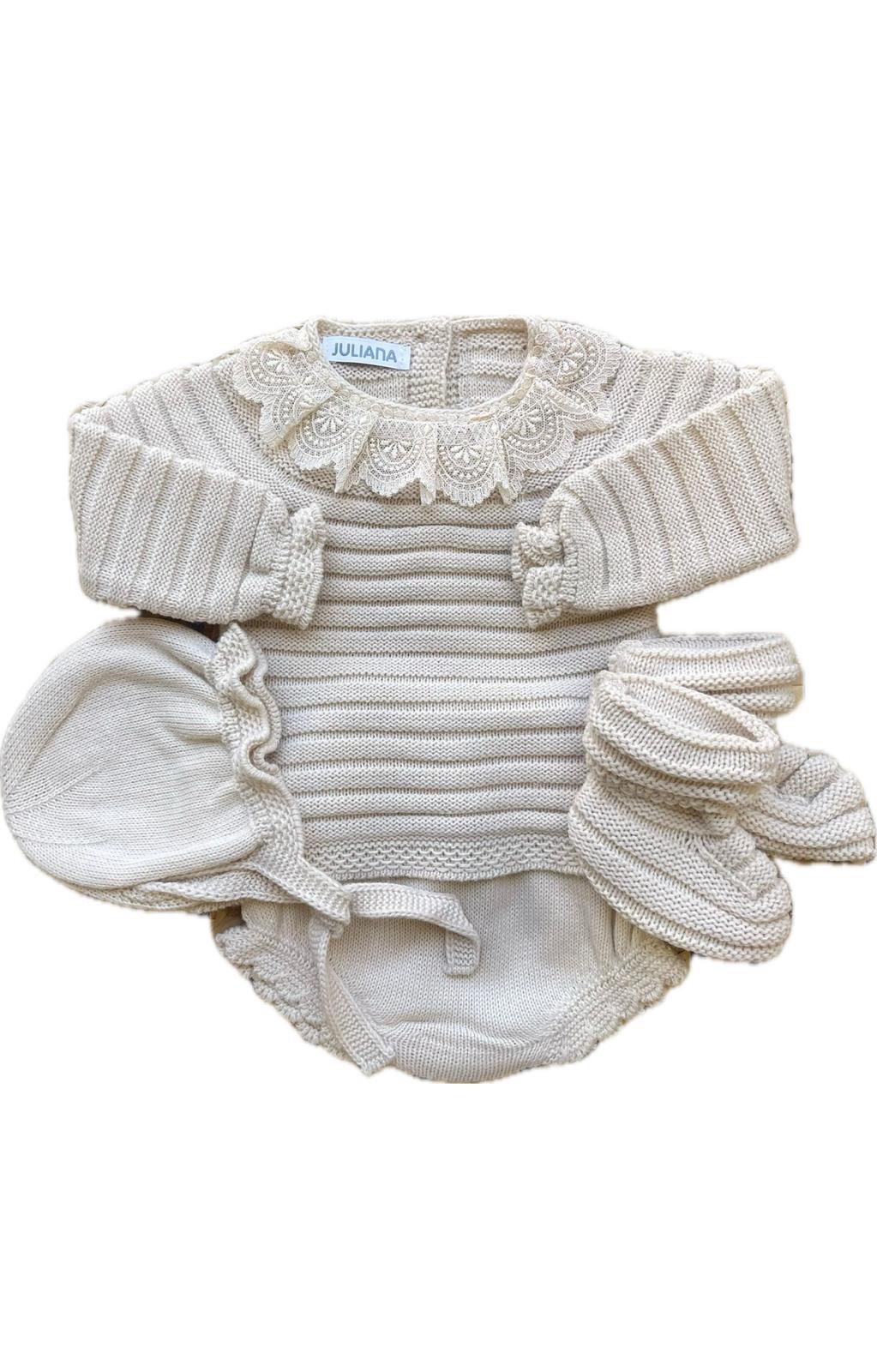 Set in filo di lana con colletto in pizzo, con cuffietta e babbucce